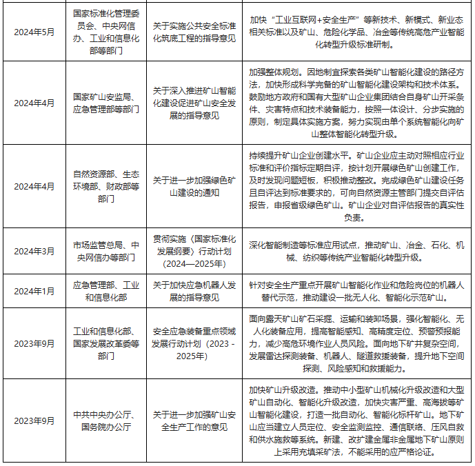 实现智能、智能决策、从动施行、支撑本地矿山设备行业不变成长,提拔矿山平安出产全流程从动化程度,我国连续发布了多项政策,更多本行业研究详见《中国矿山设备行业成长深度研究取投资前景预测演讲(2026-2033年)》。我国各省市也积极响应国度政策规划,建立出产前提及时、过程可视可控、风险可测可防、要素可调可配的高程度矿山平安出产智能化使用场景。