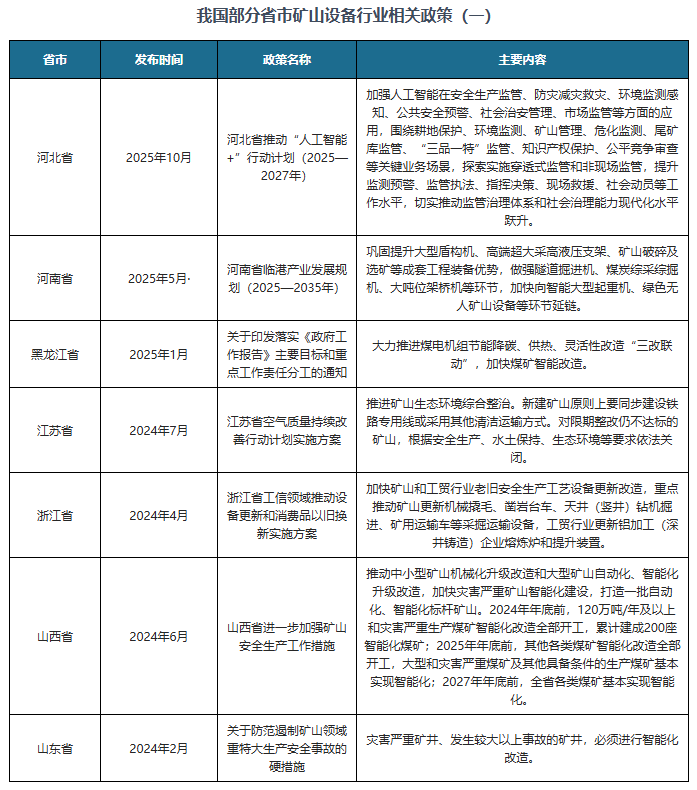 实现智能、智能决策、从动施行、支撑本地矿山设备行业不变成长,提拔矿山平安出产全流程从动化程度,我国连续发布了多项政策,更多本行业研究详见《中国矿山设备行业成长深度研究取投资前景预测演讲(2026-2033年)》。我国各省市也积极响应国度政策规划,建立出产前提及时、过程可视可控、风险可测可防、要素可调可配的高程度矿山平安出产智能化使用场景。